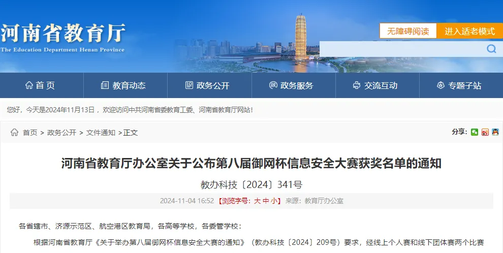 11月4日,河南省教育厅发布《关于公布第八届御网杯信息安全大赛获奖名单的通知》(教办科技〔2024〕341号)。根据河南省教育厅《关于举办第八届御网杯信息安全大赛的通知》(教办科技〔2024〕209号)要求,经线上个人赛和线下团体赛两个比赛环节,信阳职业技术学院开云kaiyun官方网站代表队,凭借精彩的发挥,在各大高校参赛选手中脱颖而出,喜获9个奖项:线上个人赛二等奖6项、三等奖1项,线下团体赛一等奖2项。